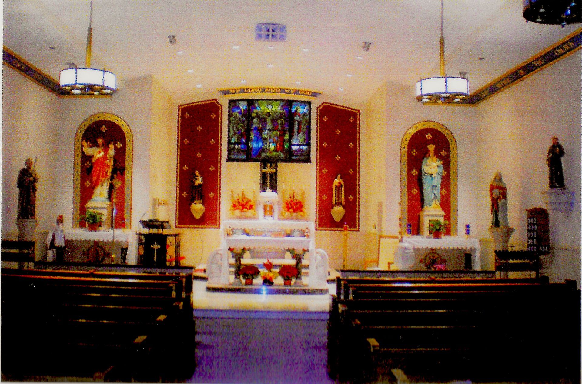 Left: The earliest historic photo of the original sanctuary of St. Boniface Church, Wilkes-Barre. Rev. Charles Von Welden, second pastor, served at St. Boniface from 1911-1920, thus responsible for this photo. He was ordained in 1893. The script on the sanctuary wall reads, "1896 Tu Es Sacerdos In Aeternum 1918" (You are a Priest Forever). 22 years does not indicate his silver ordination; thus it seems to be celebrating Corpus Christi; Jesus exposed would be the high priest.